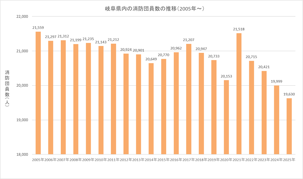 岐阜県内には約2万人の消防団員がいます。人口減少等の影響により団員数は減少傾向にあり、団員確保は大きな課題となっています。
