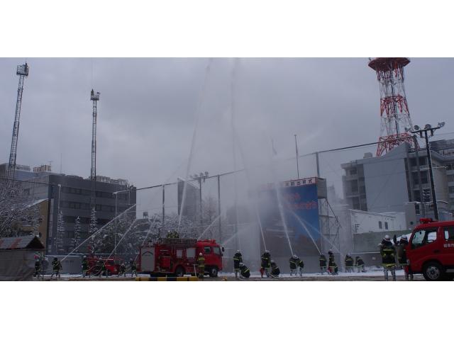 車両分列行進、消防定例表彰式、消防職団員による訓練展示、一斉放水など行い、防火思想の普及を図りました。