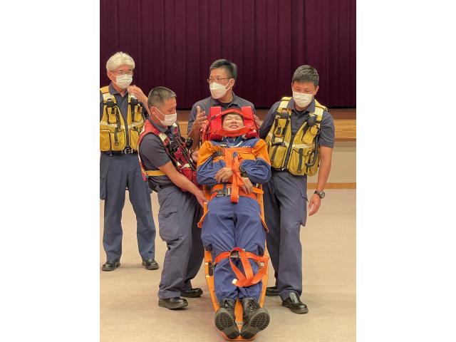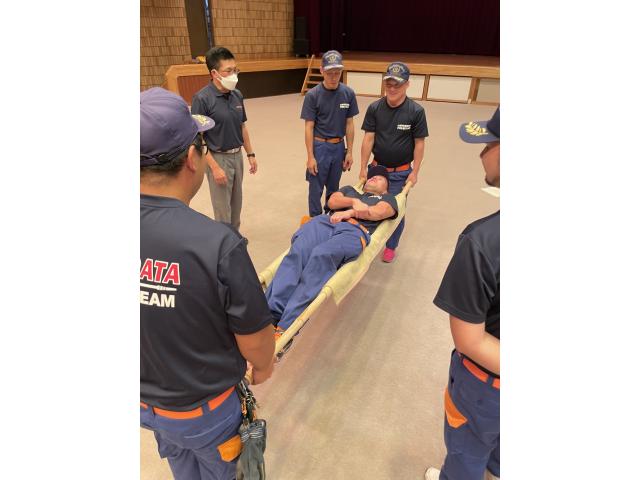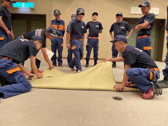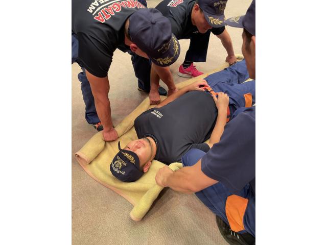 消防団が知っておくべき救急法として、岐阜市消防本部山県消防署の救急救命士を講師に、けが人の頸椎保護や搬送方法などについて学びました。