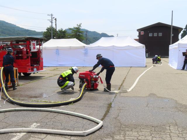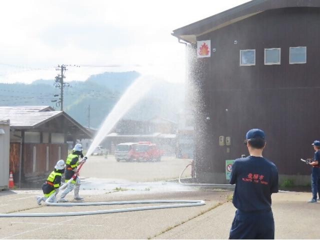 飛騨市消防団では、「NEO(新しい)飛騨市消防団」をキャッチフレーズに、今までの規制概念にとらわれることなく操法や式典行事の見直しを行い、団員およびその家族の負担軽減に取り組んでいます。従来行われてきた市操法大会は令和5年度の大会をもって最後とし、令和6年度からは実戦的な消火技術の習得を目的とした「飛衛消火訓練会」を実施しています。令和7年度の訓練は、消防車両が火災現場近くに駐車できない、狭い住宅密集地火災であるため、複数の可搬ポンプを使って消火活動や延焼防止に努めるという想定で行い、8チームが出場し、日頃の訓練の成果を発揮しました。