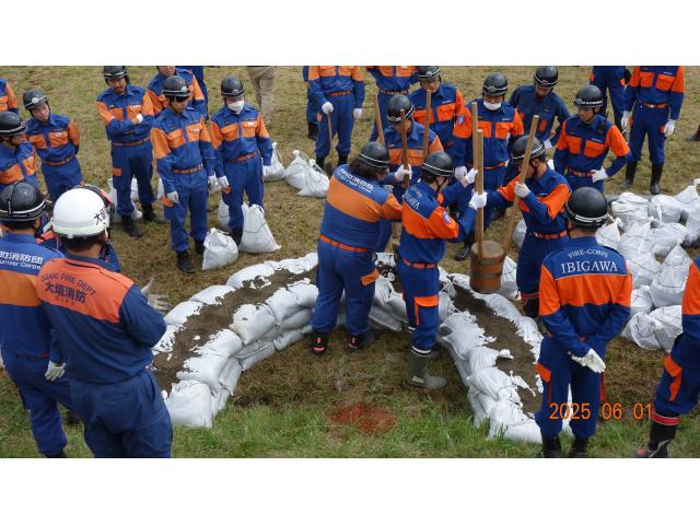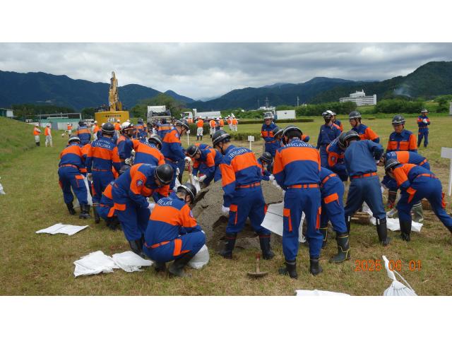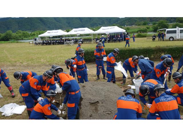 台風、洪水に備え、土のう作成や倉庫点検などを行っています。