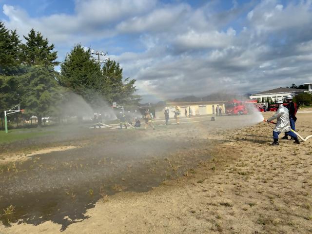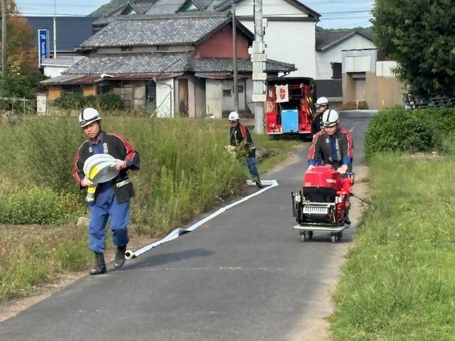 令和7年9月29日に行った機動演習の様子です。富加小学校で建物火災が発生した想定で消火活動にあたりました。各班ポンプを利用し、周囲の水利からホースを展張して水を出しました。また、可茂消防事務組合富加出張所と合同で行い、水利から出張所のタンク車に水を補給する訓練も行いました。