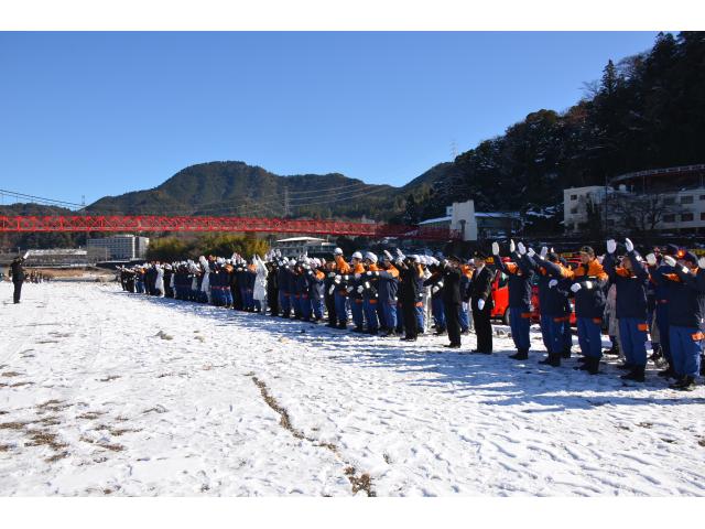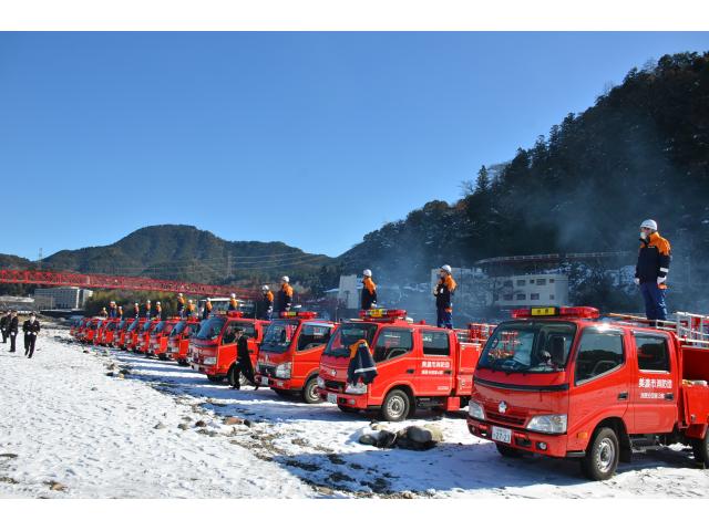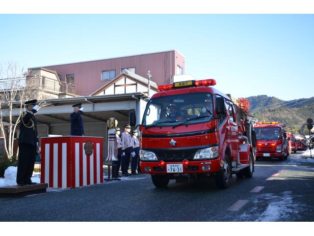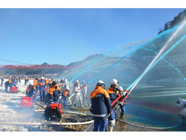 消防団員が規律正しく行進し、迅速な動作で放水を開始する姿を示します。団結力と技術を披露し、防災意識を高めます。