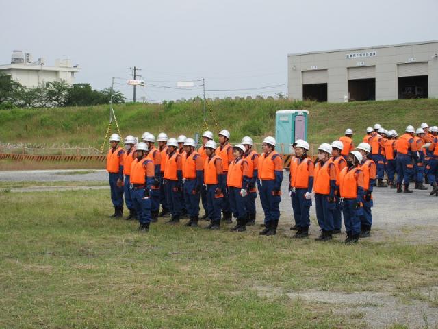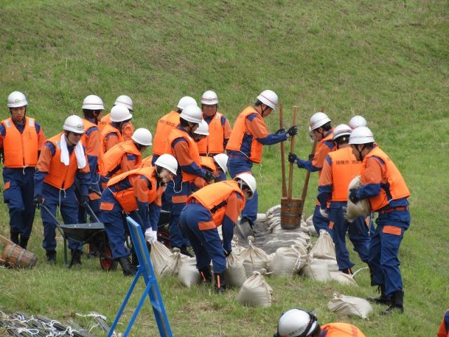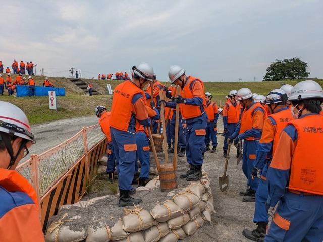 令和7年度瑞穂市水防訓練を牛牧グラウンドにて実施しました。 訓練は瑞穂市水防団(消防団)により、積み土のう工、改良積み土のう工、月の輪工といった、漏水・越水防止のための水防工法を中心に実施し、出水期にあたり各工法の確認を行いました。また女性消防班から10名の団員が訓練に参加し積み土のう工を実施しました。