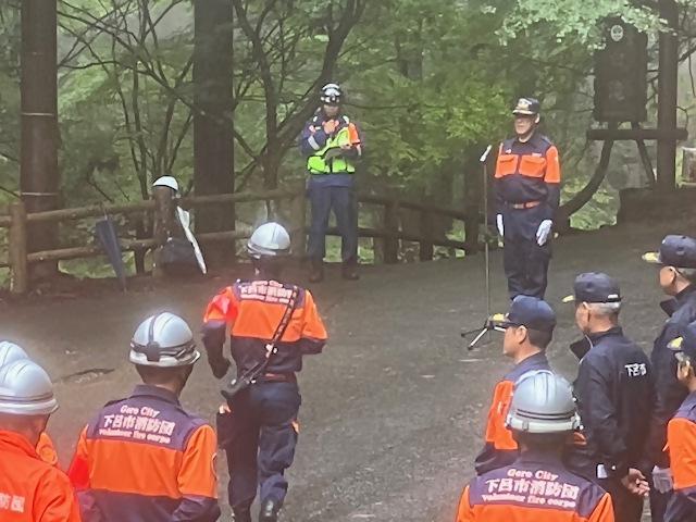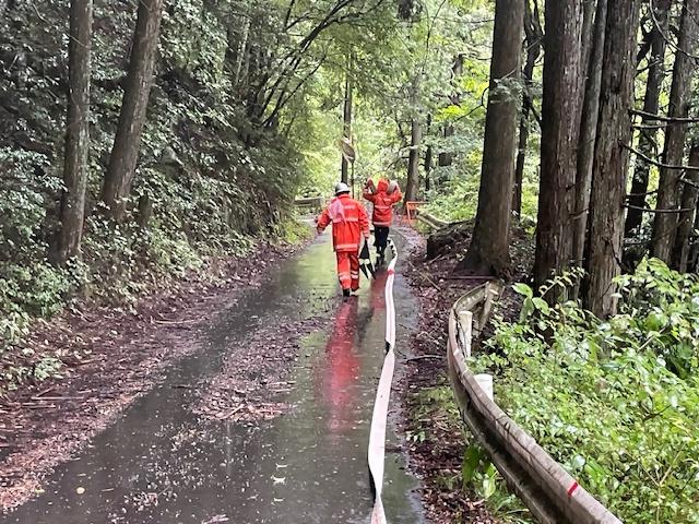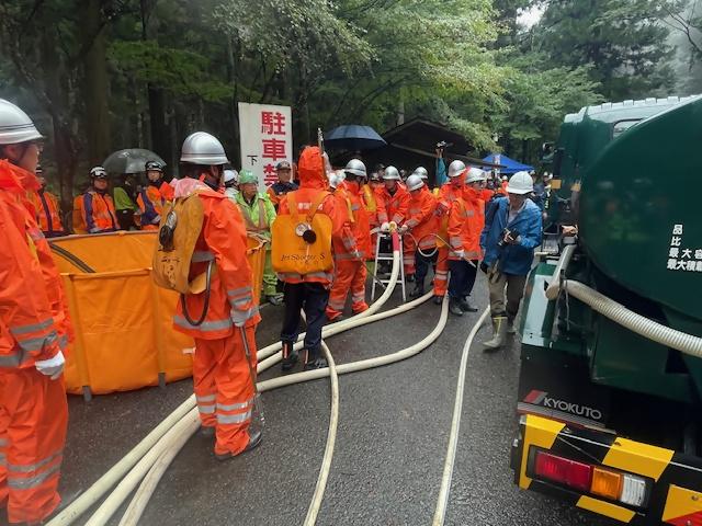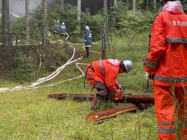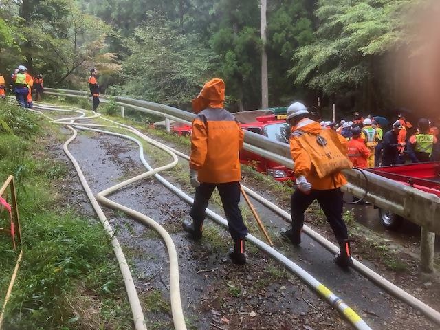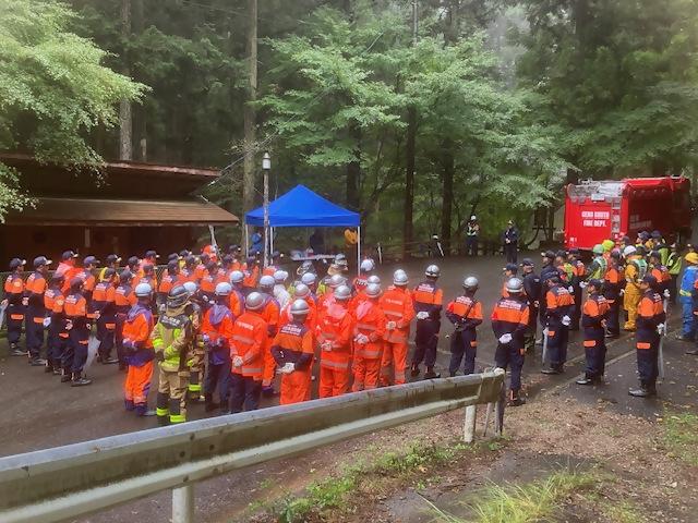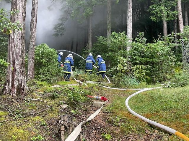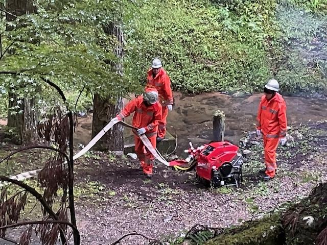 全国各地で大規模な林野火災が頻発している状況に鑑み林野火災防御訓練を実施しました。下呂市消防団、下呂市消防本部に加え下呂建設業協会に散水車運航の協力を得て連携の確認を行いました。山林という環境下で長距離送水、簡易水槽組立て、ジェットシューターによる残火処理等を行い非常に有意義な訓練となりました。