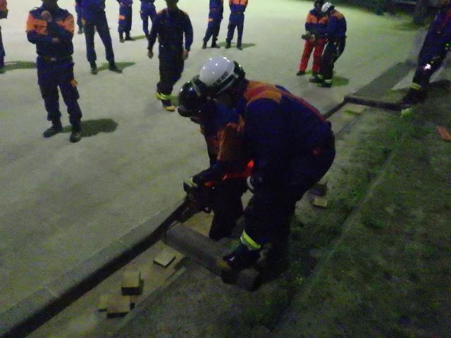 消防署の指導の下、災害時に倒壊家屋の木材切断、瓦礫や閉じ込められた際の障害物を切断・撤去するために使用されるチェーンソーやエンジンカッターの取扱訓練を行いました。