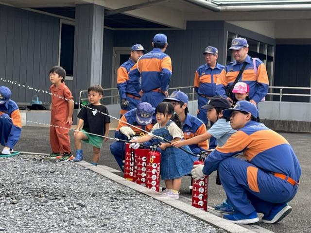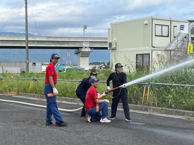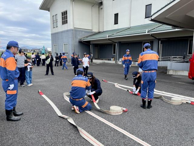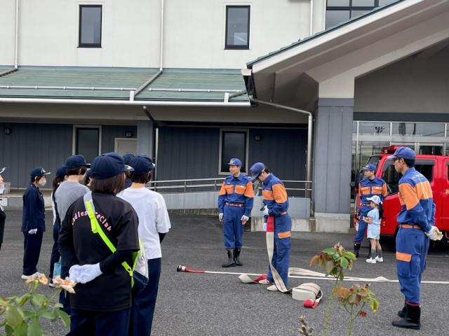 9月28日(日)、女性防火クラブの防火講習会が浄化センターで開催され、消防団が講師として出向きました。 ホースを使用した水出し体験、消火器取り扱い体験、消防車両の説明を実施し、消火機器を扱う際の注意点やコツなど、火災予防に関する知識・技術を身に着けていただきました