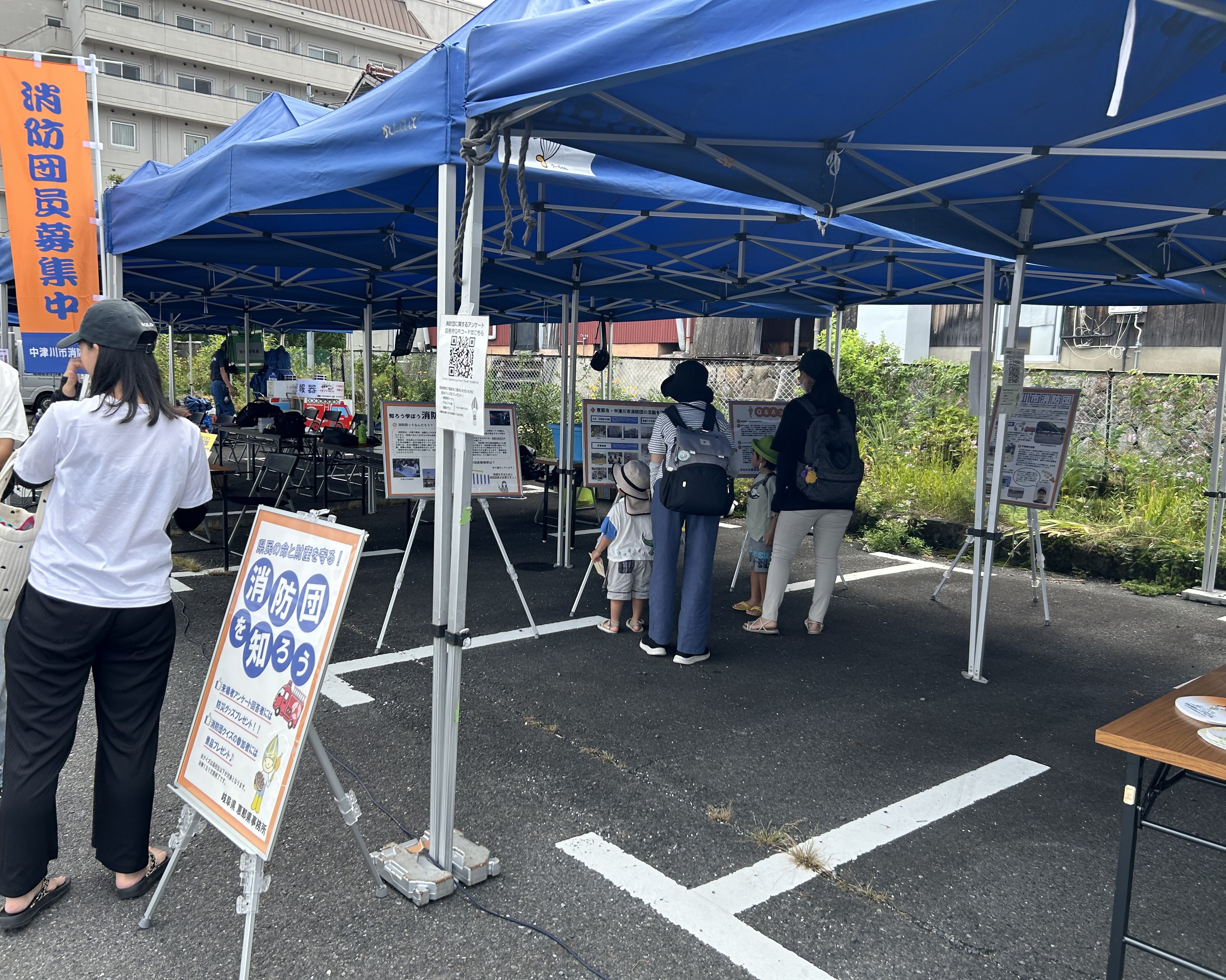 管内2市の消防フェスティバルにて、協議会ブースを出展し、消防団に関するクイズとアンケートを実施しました。パネル展示を見ていただき、地元消防団の活動を知ってもらえる良い機会になりました。