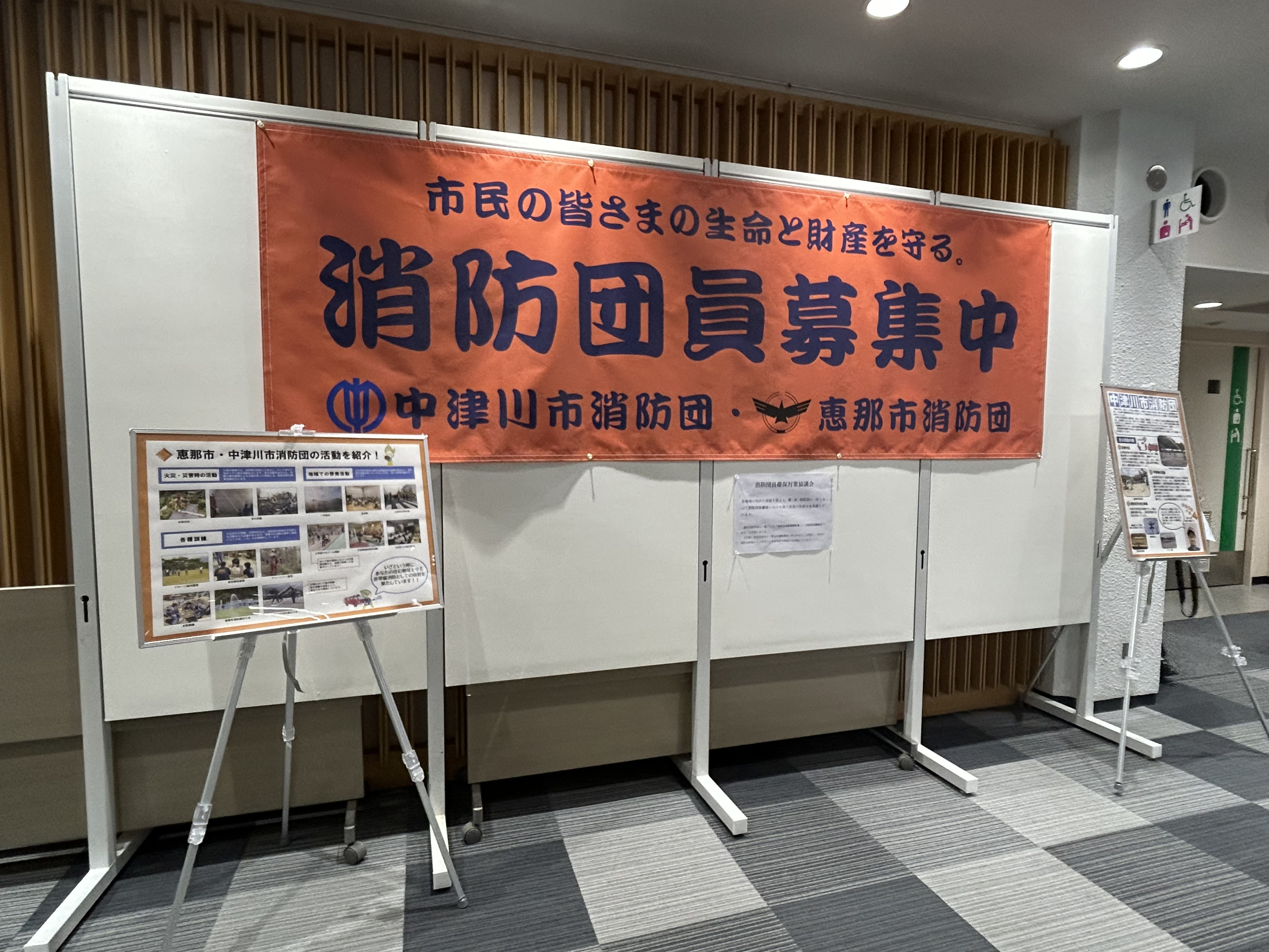 中濃地域の防災・消防関連イベントに出展し、消防団のPR(顔出しパネル設置、子ども用消防団服の貸出、チラシ・啓発物品配布等)を行ったほか、消防団の活動紹介パネルを制作し、中濃総合庁舎1階ロビーに展示しました。