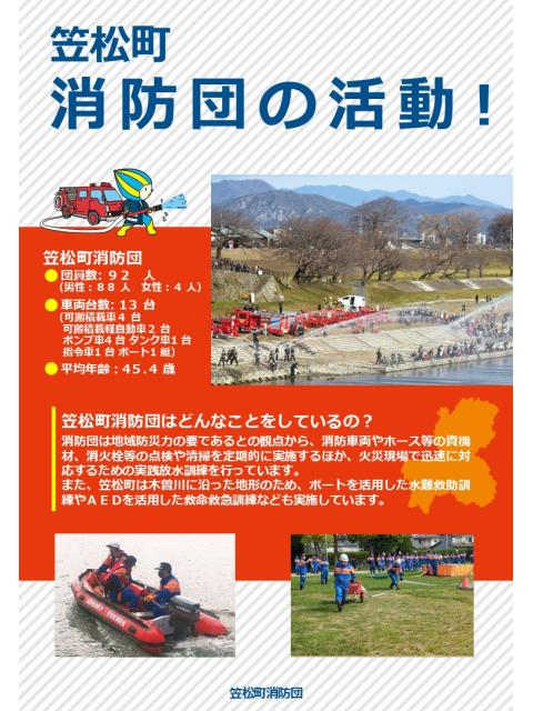 | 消防団のPR | 消防団員は、「わがまちを災害から守る」という使命感のもと、仕事を持ちながら、地域の防災リーダーとして幅広い活動を行っています。 笠松町の消防団員の年齢層は幅広く、また、職業も自営業者、サラリーマンなど様々な人々が集まった仲間です。消防団の活動を通じて、お互いの絆は大変強いものがあります。 地域の安心・安全を守り、災害のないまちづくりのために、是非あなたの力をお貸しください。 |