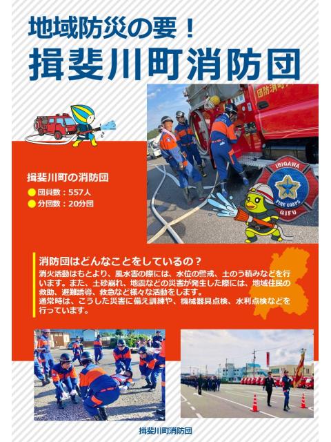 | 消防団のPR | 消火活動はもとより、風水害の際には、水位の警戒、土のう積みなどを行います。また、土砂崩れ、地震などの災害が発生した際には、地域住民の救助、避難誘導、救急など様々な活動をします。 消防車、救助車、消防バイクやドローンなど多種多様な災害に備え様々な資機材を所有しています。 |
