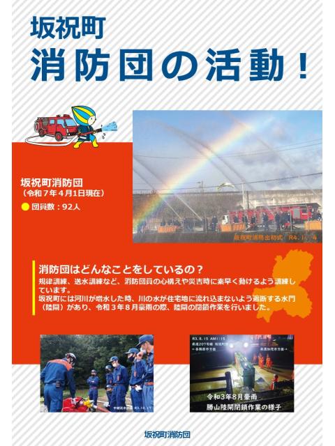 | 消防団のPR | 坂祝町消防団は、火災や災害時に地域の安全を守る、町民による防災の要です。 現在、私たちと一緒に活動していただける仲間を募集しています。 日頃はそれぞれの仕事を持ちながら、火災出動や訓練、防災啓発活動などに参加し、地域の安心・安全を支えています。 近年は大規模災害も多く、地域の防災力を高めるため、皆さん一人ひとりの協力が欠かせません。 「地域のために何かしたい」「消防や防災に関心がある」 そんな思いを持つ方、ぜひ坂祝町消防団へご参加ください。 |