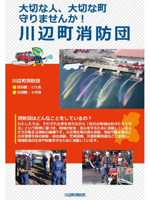| 消防団のPR | 川辺町消防団では今が変革のチャンスと捉らえ、団員の負担軽減とやりがいの向上を図っています。古くからの習わしだけで行っている行事を廃止する等の改革を継続する事で、まずは現団員に負担の低減を実感していただき、それが未来の若者に波及していく事でひとりでも多くの方に加入していただける消防団となる様に努めています。 |