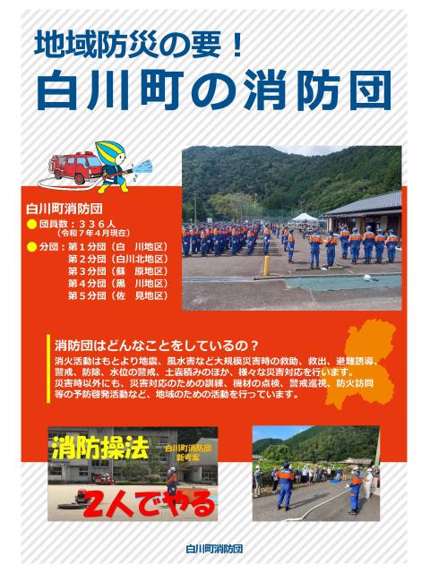 | 消防団のPR | ・「シン・操法」(最少人数で行う消火活動訓練)の考案 【シン・操法訓練動画】(白川町公式YouTube) https://youtu.be/0P6V7n_zEV4 ・動画を使って訓練の習熟度や効率化を促進 ・防災に役立つ資格取得等への補助 ・地域住民が使いやすい消火栓使用方法の考案 全国の消防団で団員数の減少という課題を抱える中、「今後も持続可能な白川町消防団の形成」を目指し、“地域の防災力を維持するための活動”を行っています。 |