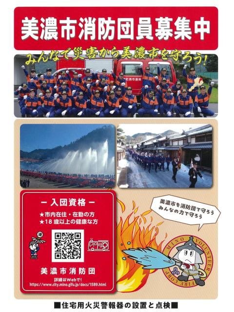 | 消防団のPR | 火災、水害や地震などの災害時、地域の要として活動するのが消防団です。 今、消防団はあなたの力を必要としています。 あなたも地域の「防災ヒーロー」になってみませんか。 まちを守る、安心をつくる美濃市消防団!! |