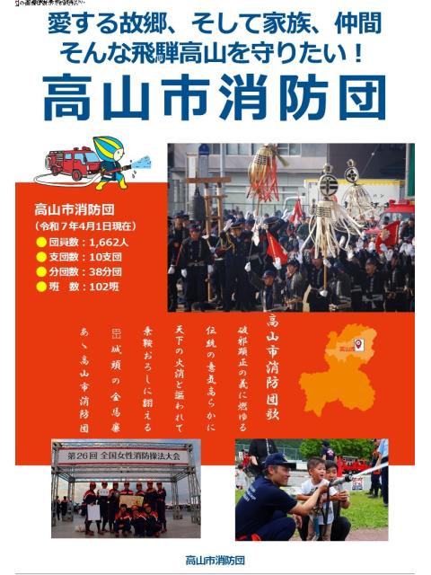 | 消防団のPR | 高山市消防団は、山間地から市街地まで広がる市内全域を守るため、10の支団で活動しています。各種災害対応はもちろん、地域行事や防災訓練を通じて、市民の皆さんと共に安全・安心なまちづくりに取り組んでいます。例年実施していた「消防操法大会」を令和5年から「消防フェスティバル」と改名し操法技術等の展示のほか、地震体験や放水体験コーナー、子供たちへの消防団クイズなど見る・学ぶ・体験することをコンセプトに開催しています。 世界に誇る高山市の伝統や自然を未来へつなぐために、「自分たちのまちは自分たちで守る」という想いのもと頑張っています。 |