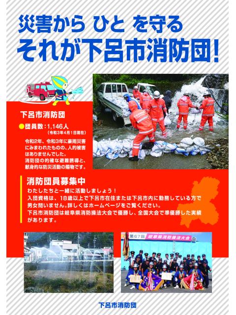 | 消防団のPR | 下呂市消防団は総員1,037人で地域を守っています。 「いざ!」という時に集結し、 火災や災害から地域と大切な人を守る。 下呂市消防団は地域防災の要です。 |