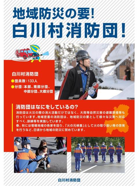 | 消防団のPR | 世界遺産・白川郷の合掌造りをはじめとする、白川村の美しい景観と、そこに暮らす人々の安全を守るのが、私たち白川村消防団の使命です。 火災はもちろん、自然災害への対応、そして平時からの地域見守り活動など、活動は多岐にわたります。地域に根差した活動を通じて、かけがえのないむらの暮らしを守りませんか。 |