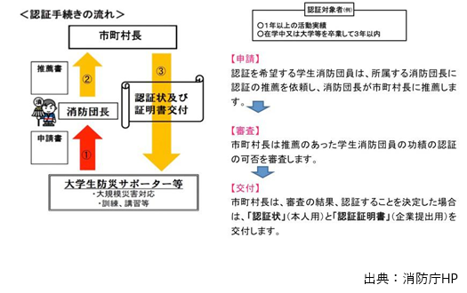 「学生消防団活動認証制度」とは、消防団員として活動した学生に対し、市町村長が「学生消防団活動認証証明書」を交付する制度です。この制度は、経済団体へも周知されていますので、この証明書は、就職活動の自己PRなどで活用できます。
